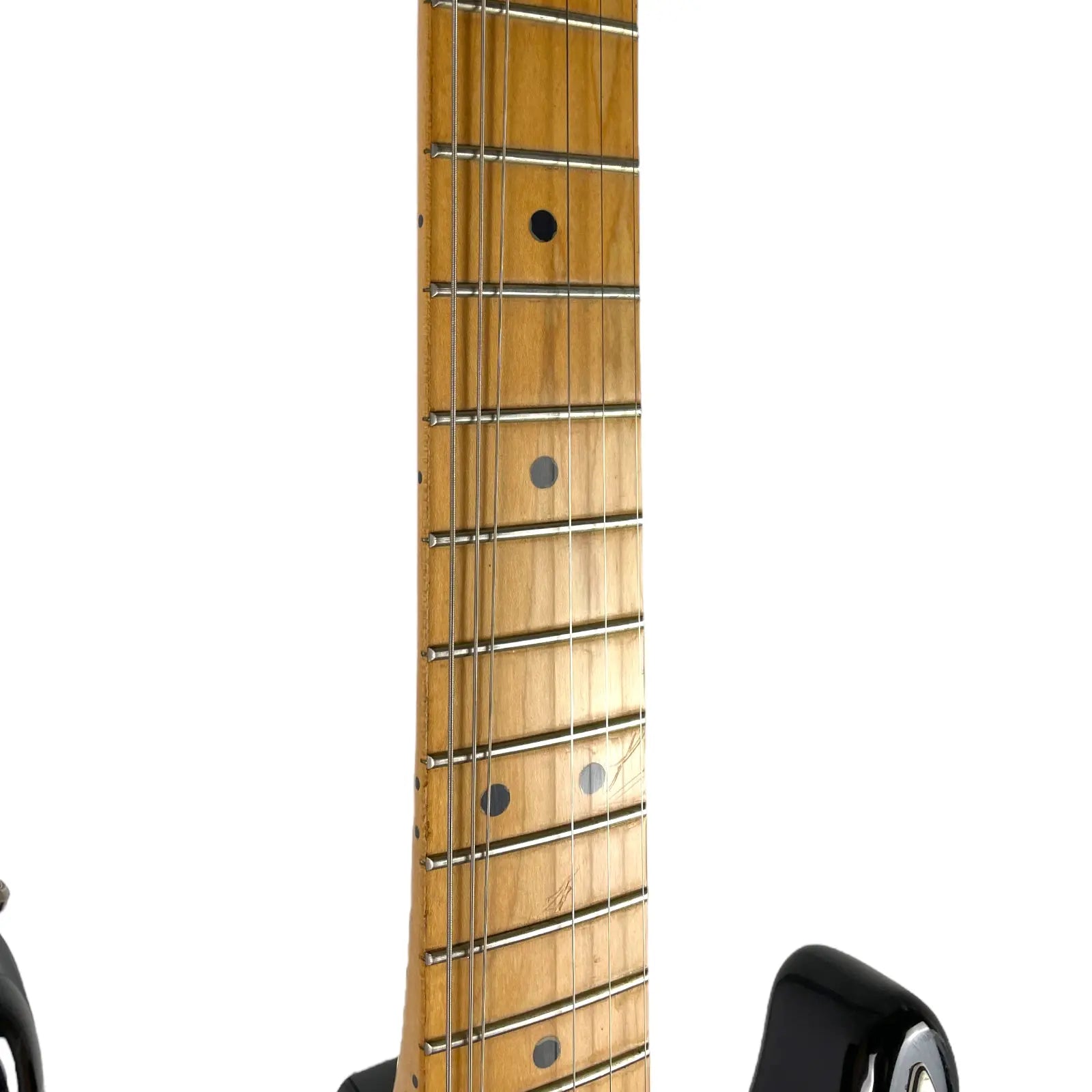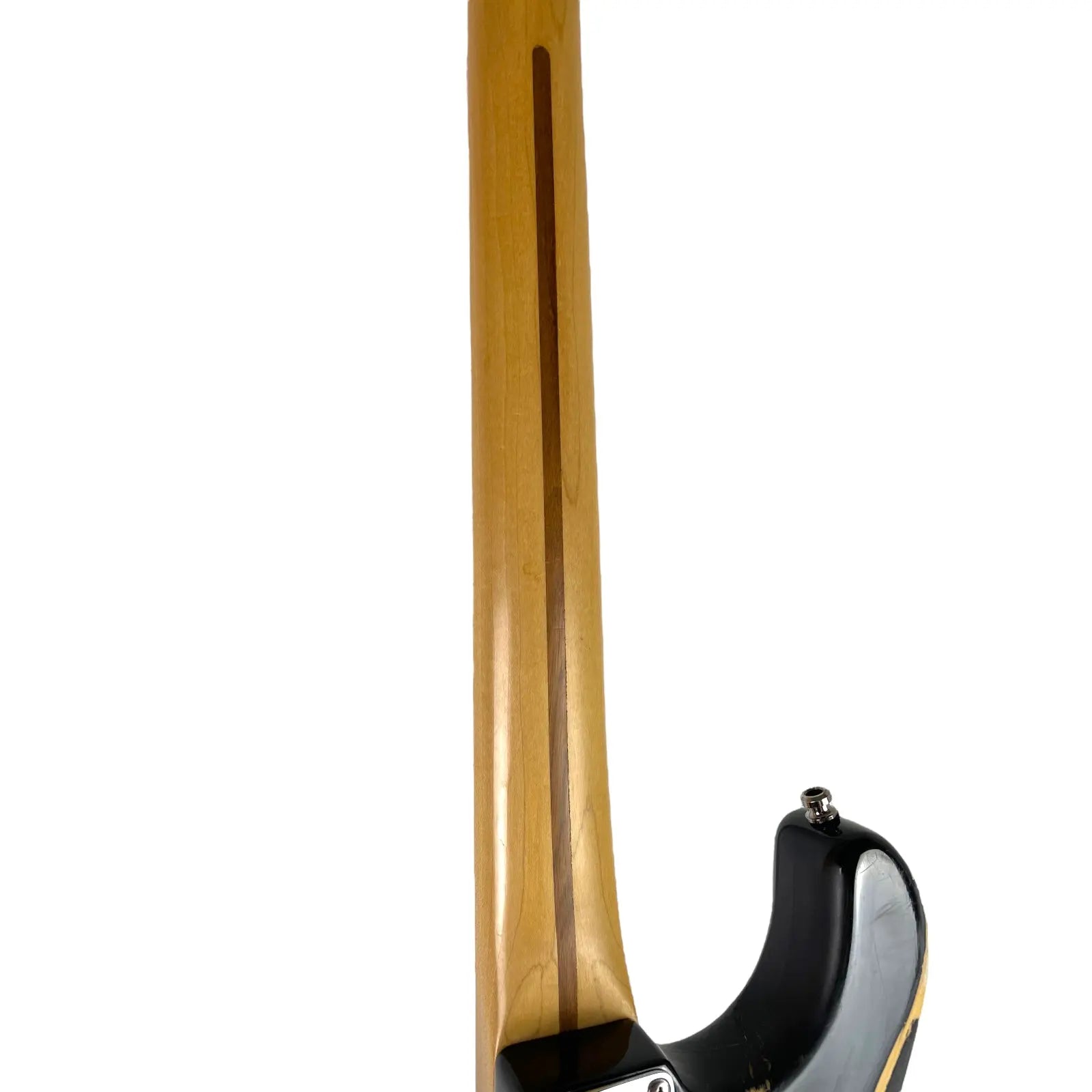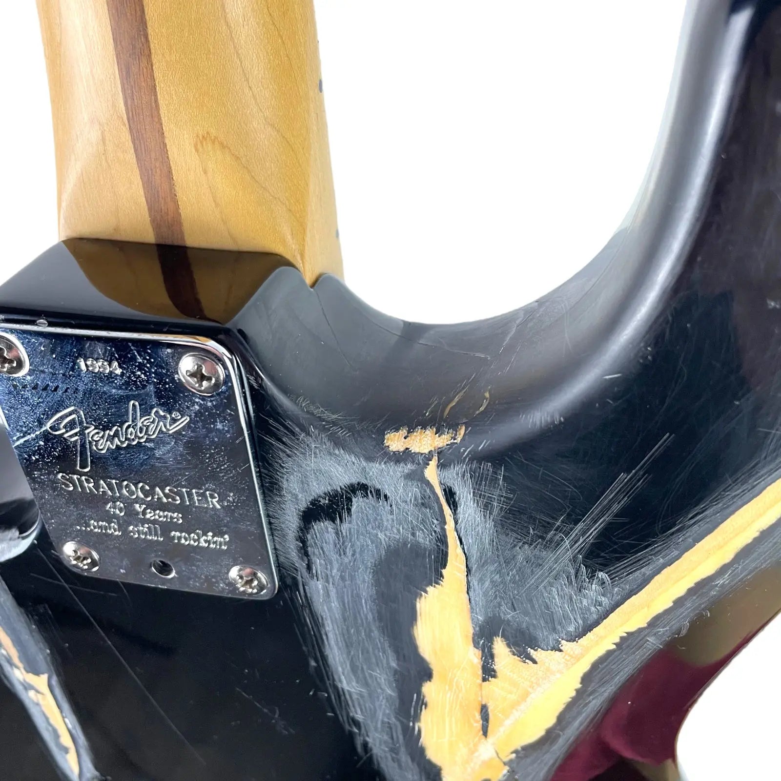 Les frettes montrent déjà des signes d'usure, mais offrent toujours une sensation de jeu confortable. La couverture au dos n'est plus présente. Le levier a également été remplacé.